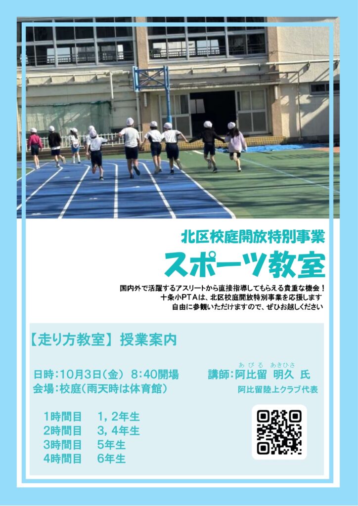 10/3 北区校庭開放特別事業開催のお知らせ 2025年9月22日 最終更新日時 : 2025年9月25日 admin 今年度も、十条小学校では校庭開放特別事業を行います。 第1回は 10月3日(金)「走り方教室」 です。 世界陸上で選手たちが輝いたように、十条小の子どもたちも挑戦します! 来月の6年生アスレチックチャレンジや体育学習発表会に向けて、 一人ひとりが自分の走りを磨くチャンスです。 保護者の皆様や地域の皆様もご覧いただけます。 子どもたちの元気いっぱいの姿を、ぜひ応援しに来てください!