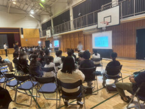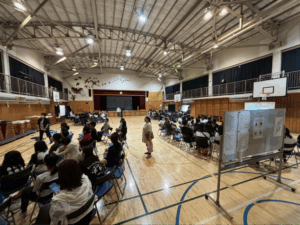 体育館では、5・6年生による理数課題研究発表会が行われました。夏休みの自由研究をまとめ、A〜Dの4つのブースに分かれて発表。”空気砲について”や”鉱物の作り方”など、それぞれのテーマに挑戦しました。初めての発表で緊張していた5年生も、発表を終えるとホッとした表情に。6年生はさすが最上級生、堂々とした発表と受け答えで大きな成長を感じさせてくれました。会場には入りきれないほどの保護者が集まり、子どもたちの熱心な姿を温かく見守ってくださいました。