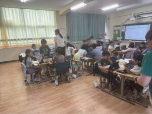 1年生は英語の授業。「Touch your head!」の合図に合わせて体を動かしながら、楽しく言葉を覚えていました。2年生は音楽で『アンダルゴ』を合奏。息を合わせて演奏する姿に、思わず拍手がわきました。3年生は図工で絵の具を使った作品づくり。きれいな色の重なりに、中学年らしい工夫が光っていました。4年生は男女別に保健学習を行い、体の成長について真剣に学んでいました。